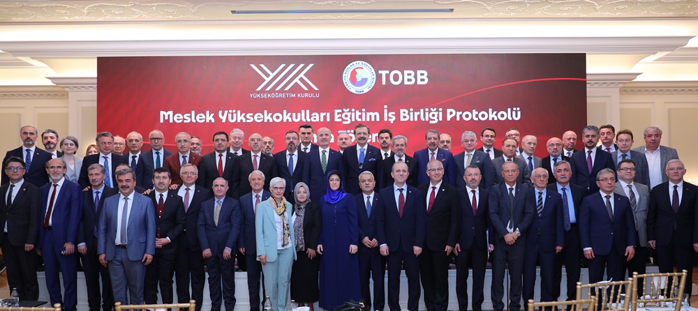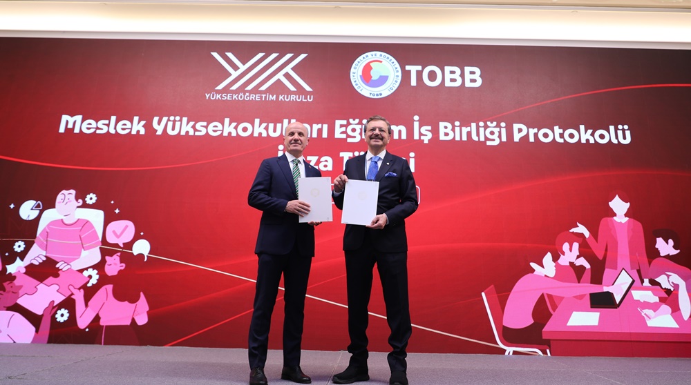 The Council of Higher Education (CoHE) and the Union of Chambers and Commodity Exchanges of Türkiye (TOBB) signed the “Cooperation Protocol for Vocational Schools Education”. CoHE President Erol Özvar and TOBB President Rifat Hisarcıklıoğlu signed the protocol. CoHE members, including CoHE Executive Board members, TOBB members, industry representatives and the rectors of 43 universities attended the ceremony held at TOBB Towers.