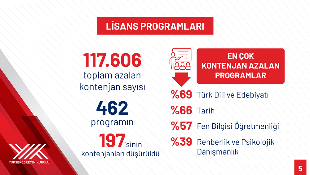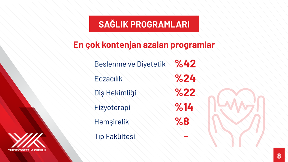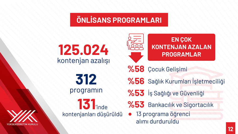 Özvar stated that quotas were reduced in 131 out of 312 associate degree programs during 2023-2025, resulting in a total reduction of 125,024 places. Programs with the largest decreases included Child Development (58 percent), Health Institutions Management (56 percent), Occupational Health and Safety (53 percent), Banking and Insurance (53 percent), and Medical Documentation and Secretariat (51 percent).