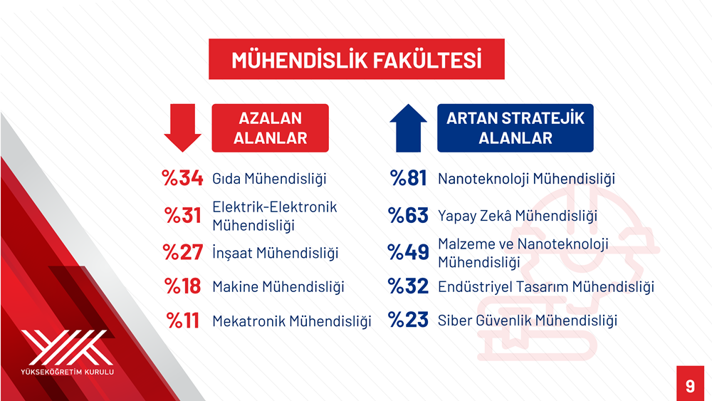 According to Özvar, programs with increased quotas include: Artificial Intelligence Engineering (63 percent); engineering programs such as Cybersecurity Engineering and Geomatics Engineering (23 percent); Ship and Marine Technologies Engineering (19 percent); Geological Engineering (8 percent); Nanotechnology Engineering (81 percent); Marine Engineering Operations (4 percent); Automotive Engineering (4 percent); Aeronautical Engineering (3 percent); Maritime Transportation Management Engineering (9 percent); Industrial Design Engineering (32 percent); Materials and Nanotechnology Engineering (49 percent); Forest Industry Engineering (16 percent); Naval Architecture and Marine Engineering (8 percent); Metallurgical and Materials Engineering (3 percent); and Fisheries Engineering (7 percent).