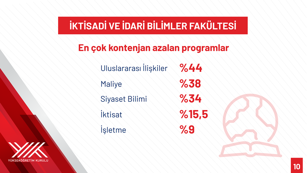Özvar stated that programs within Faculties of Economics and Administrative Sciences were also significantly affected by quota regulations: International Relations quotas fell by 44 percent (from 7,110 to 3,994); Political Science and Public Administration by 34 percent (from 8,000 to 5,285); Economics by 15.5 percent (from 9,437 to 7,972); Business Administration by 9 percent (from 13,358 to 12,158); and Public Finance by 38 percent (from 5,813 to 3,590).