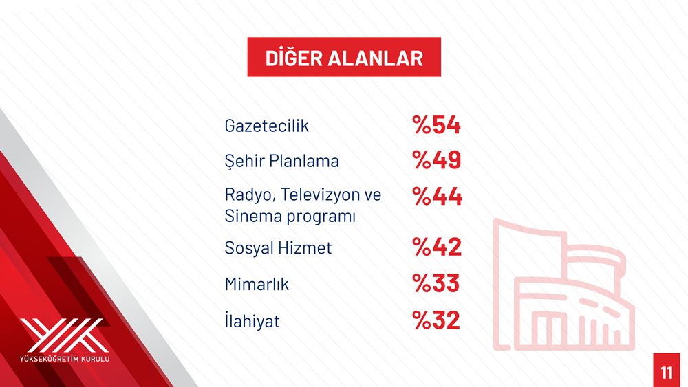 Özvar listed additional programs with major quota decreases: Journalism fell by 54 percent (from 4,677 to 1,866); Urban and Regional Planning by 49 percent (from 2,448 to 1,240); Radio, Television and Cinema by 44 percent (from 5,180 to 2,870); Social Work by 42 percent (from 4,677 to 2,691); Architecture by 33 percent (from 6,365 to 4,264); Interior Architecture by 33 percent (from 2,386 to 1,594); and Psychology by 13 percent (from 11,966 to 10,428).