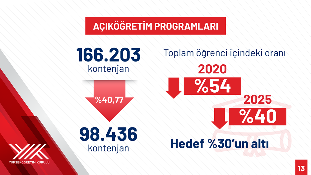 Özvar further noted that open education quotas had been reduced from 166,203 to 98,436—a 40.77 percent decrease. While open education students accounted for 54 percent of all higher education students in 2020, this ratio declined to 40 percent by 2025, with a target of reducing it below 30 percent within five years. He emphasized that open education is being restructured to serve adult education and lifelong learning rather than primarily traditional university-age students.