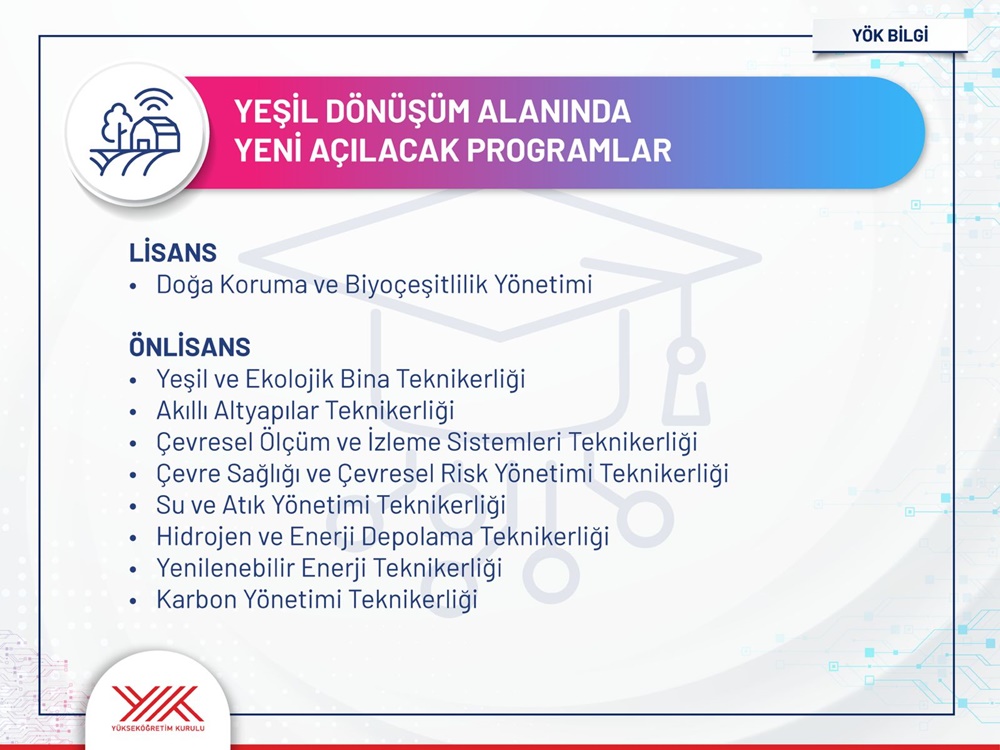 The “Nature Conservation and Biodiversity Management” program at the undergraduate level will be offered to students for the first time this year. The associate degree programs based on green transformation that will be opened for the first time this year will be as follows: Renewable Energy Technician, Water and Waste Management Technician, Environmental Health and Environmental Risk Management Technician, Smart Infrastructure Technician, Environmental Measurement and Monitoring Systems Technician, Carbon Management Technician, Hydrogen and Energy Storage Technician, Green and Ecological Building Technician.