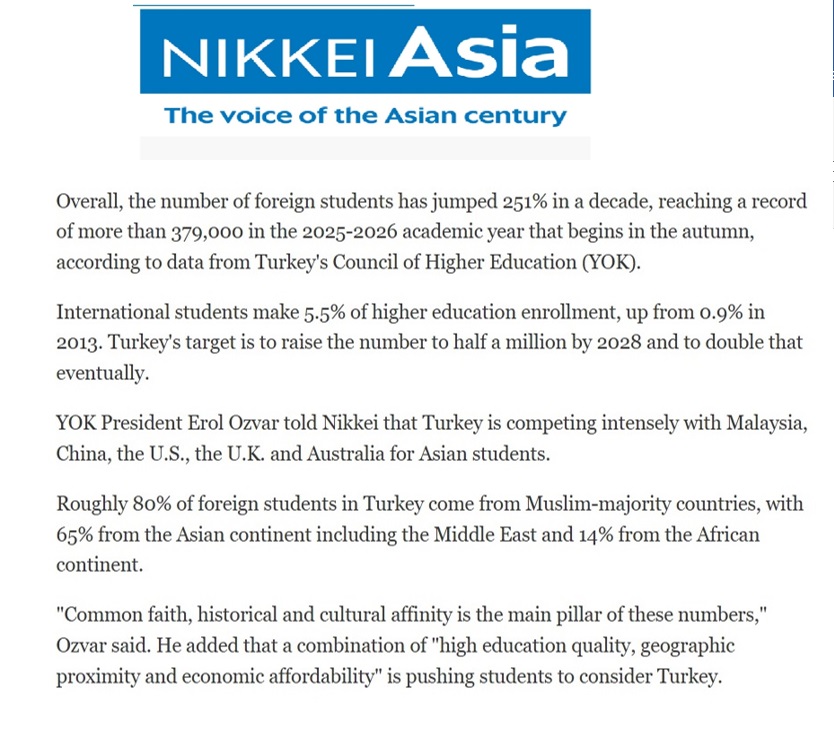 In the article published by Nikkei Asia, Türkiye was described as becoming a strong higher education hub, particularly for students from Muslim-majority countries, highlighting the significant rise in the number of international students over the past decade.