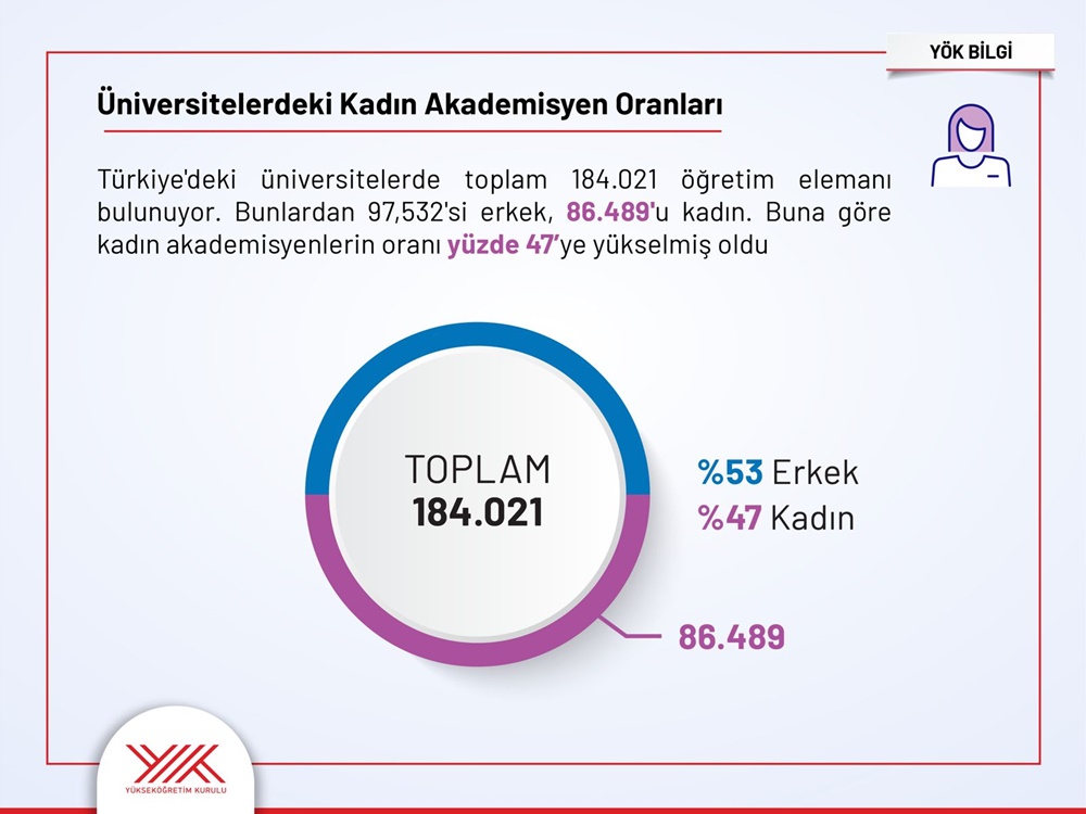 Especially in recent years, the increase in the number of female students is also reflected in the number of female academic staff. Of the 184 thousand academic staff in Türkiye, 86,500 are women. Accordingly, the rate of female academics has increased to 47 percent.