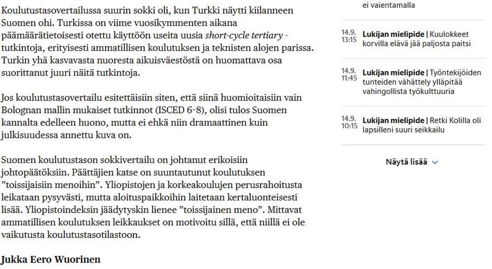 The article stated, "It is an accepted fact that the level of education in Finland is declining. Graphs illustrating countries’ education levels indicate that Finland has, for instance, fallen behind Türkiye."