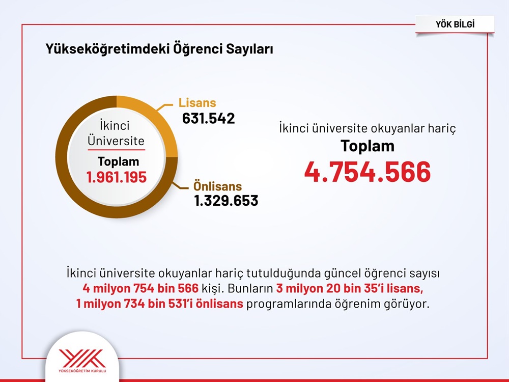 İkinci üniversite okuyanlar hariç tutulduğunda güncel öğrenci sayısı 4 milyon 754 bin 566 kişi. Bunların 3 milyon 20 bin 35’i lisans, 1 milyon 734 bin 531’i önlisans programlarında öğrenim görüyor.