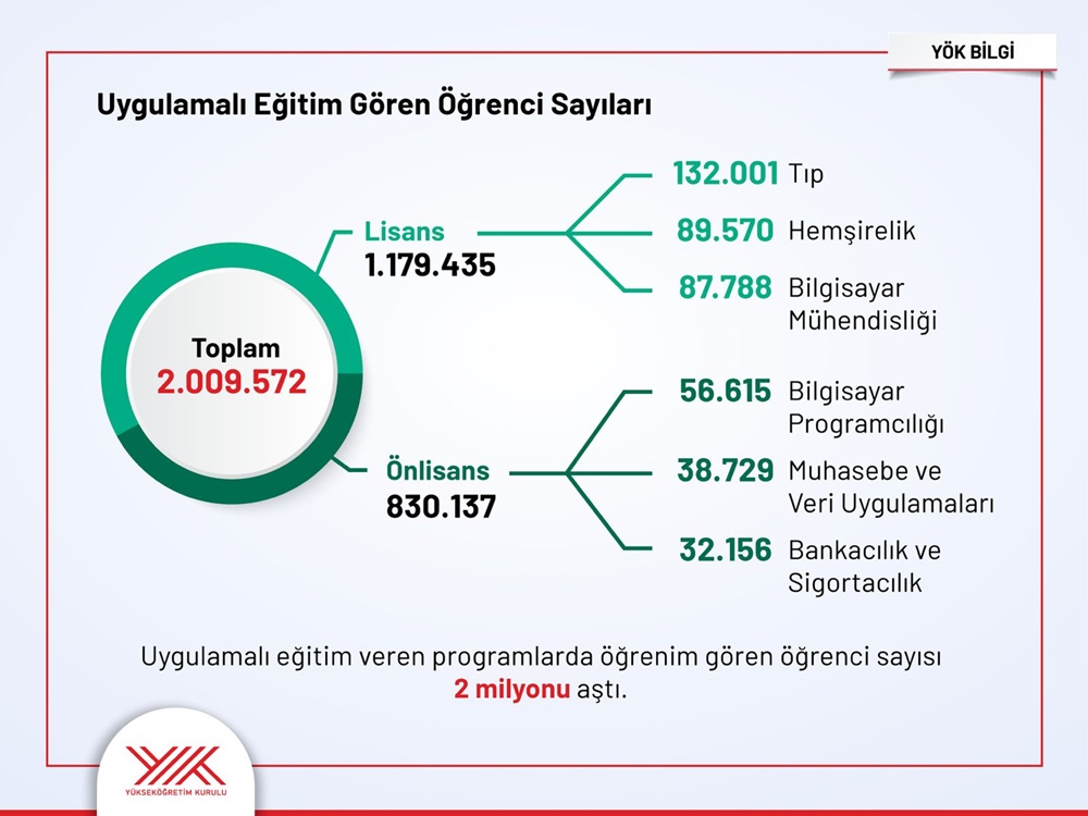 Uygulamalı eğitim veren programlarda öğrenim gören öğrenci sayısı 2 milyon 9 bin 572’ye ulaştı. Bunlardan 1 milyon 179 bin 435’i lisans, 830 bin 137’si önlisans düzeyinde öğrenim görüyor.