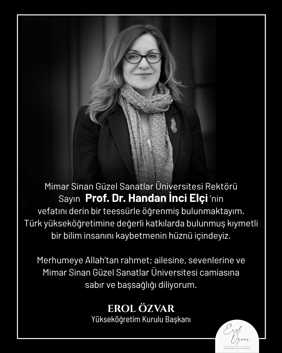 Yükseköğretim Kurulu Başkanı Erol Özvar, sosyal medya hesabından yaptığı açıklamada, “Mimar Sinan Güzel Sanatlar Üniversitesi Rektörü Handan İnci Elçi'nin vefatını derin bir teessürle öğrenmiş bulunmaktayım. Merhumeye Allah'tan rahmet; ailesine, sevenlerine ve yükseköğretim camiamıza başsağlığı diliyorum.” ifadelerini kullandı.