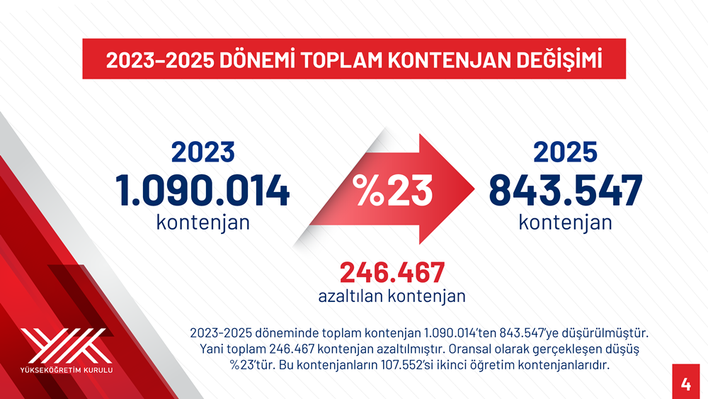 - “2023-2025 döneminde toplam kontenjan 1 milyon 90 bin 14’ten 843 bin 547’ye düşürüldü; toplam 246 bin 467 kontenjan azaltıldı. Oransal olarak gerçekleşen düşüş yüzde 23’tür”