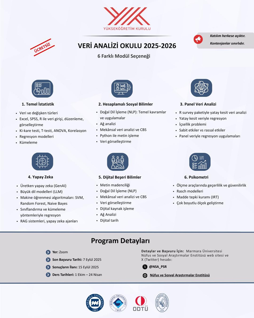 Veri Analizi Okulu, 1 Ekim 2025’te başlayacak ve 24 Nisan 2026’ya kadar sürecek. Eğitimler çevrim içi gerçekleştirilecek ve Temel İstatistik, Panel Veri Analizi, Psikometri, Hesaplamalı Sosyal Bilimler, Dijital Beşerî Bilimler, Yapay Zekâ olmak üzere altı ayrı modülden oluşacak.