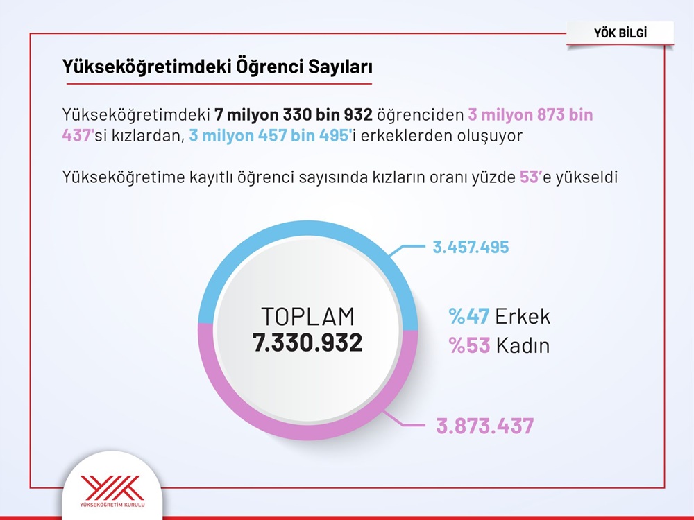 2024 yılı verilerine göre üniversitelerde 3.873.437 kadın, 3.457.495 erkek öğrenci olmak üzere toplam 7.330.932 öğrenci öğrenim görüyor. Buna göre yükseköğretime kayıtlı öğrenci sayısında kadınların oranı yüzde 53’e ulaştı.
