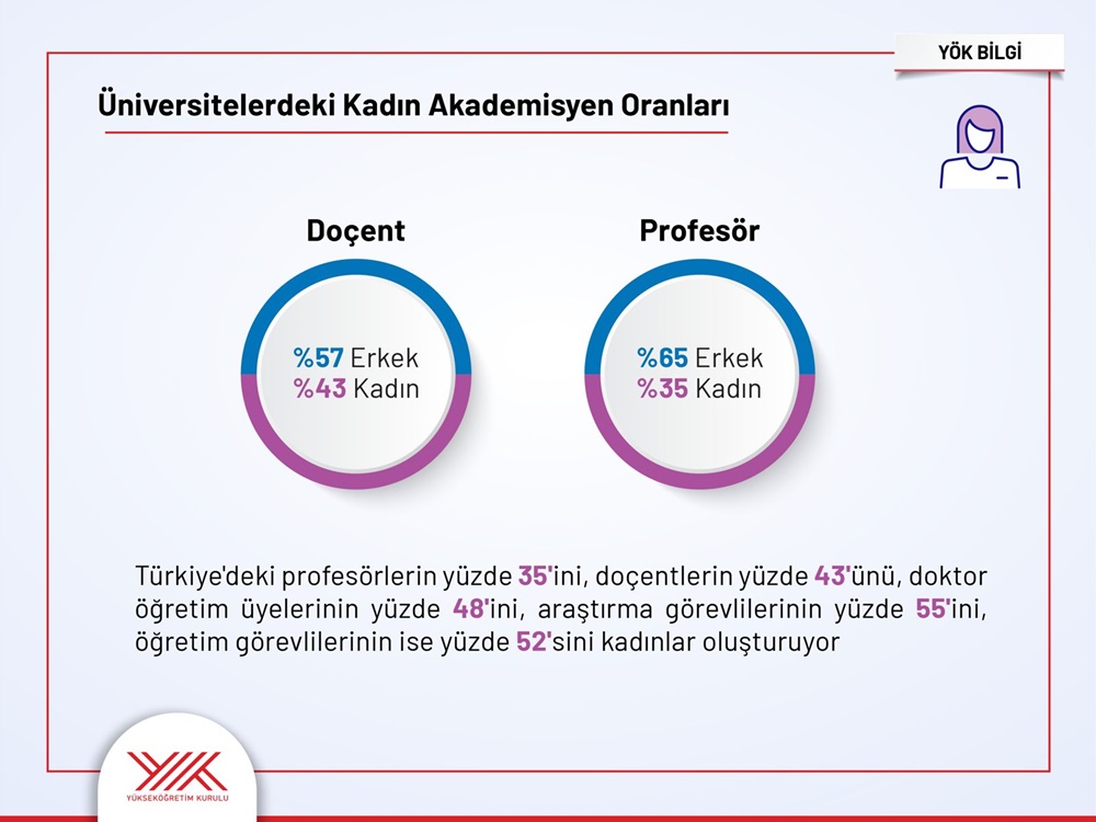 Türkiye'deki üniversitelerde profesörlerin yüzde 35’ini, doçentlerin yüzde 43’ünü, doktor öğretim üyelerinin ise yüzde 48’ini yine kadınlar teşkil ediyor.