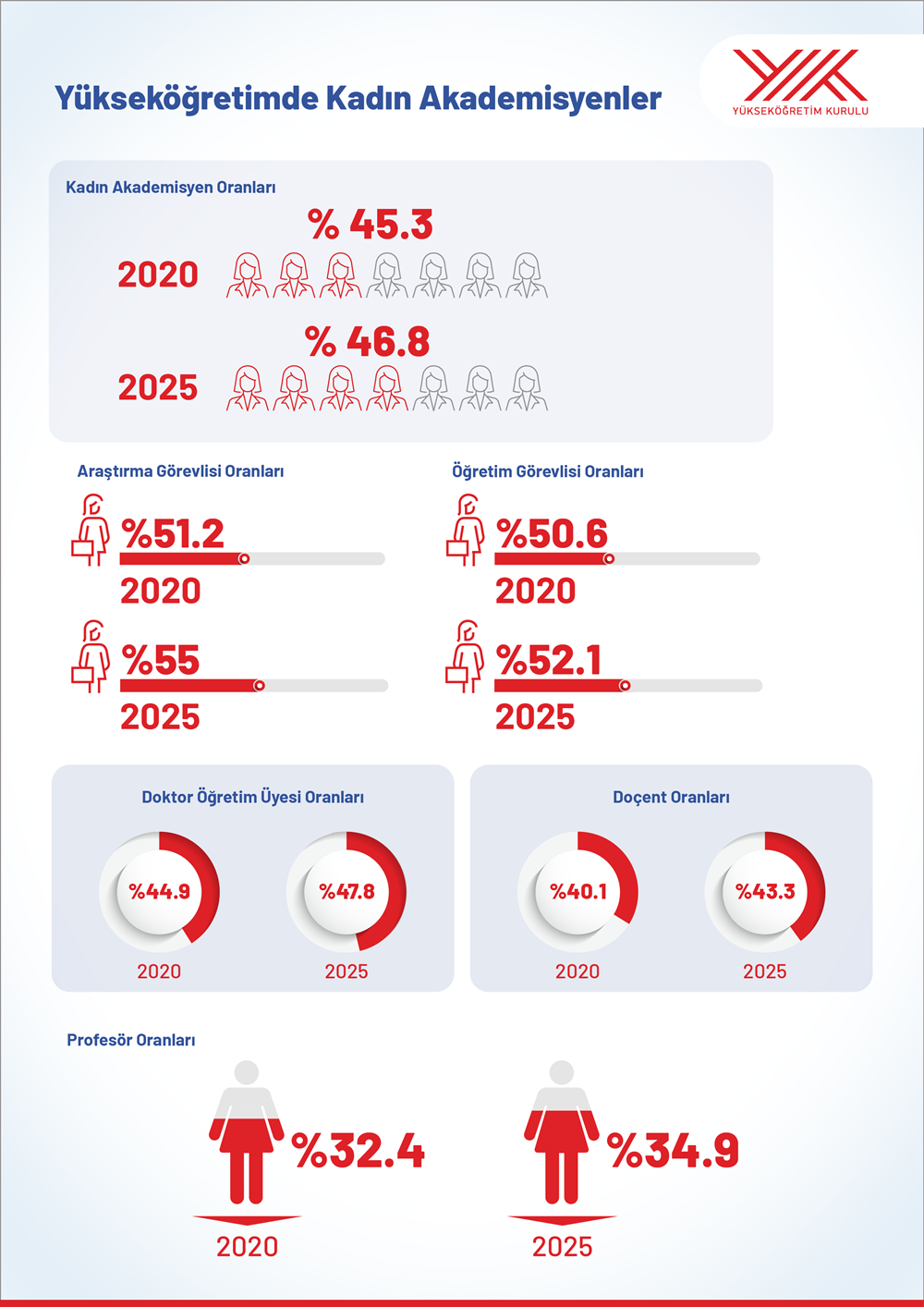 Araştırma görevlileri arasında kadınların oranı 2020 yılında yüzde 51,2 olarak kaydedilirken, 2025 verilerine göre bu oran yüzde 55’e ulaştı. Öğretim görevlisi kadrosunda da kadınların oranı yüzde 50,6’dan yüzde 52,1’e yükseldi.